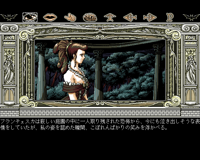 How’s she doing? She’s gotten past her fear, but she looks like she’s about to break out crying. This amuses Dracula, in such a way that he could laugh. How’s Dracula doing? Sucking that girl’s blood has made him more…vital. Well…I wasn’t missing that. Now I can talk to her. Dracula introduces himself and apologizes (ha) for making her wait. She already wants to get out of here. He asks if she’s here on her lonesome. She mentions her maid, but wonders where she went to. He wonders if she’ll return. After a little more talk, he says they should go to the palace, because she must be cold out here.